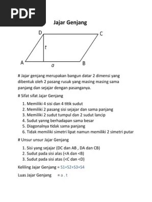 Salah satu sifat jajar genjang berkitan dengan sudut adalah bahwa jumlah dua buah sudut yang berdekatan pada jajar genjang adalah 180 derajat. Selain itu persegi panjang juga mempunyai 2 pasang sudut yang sama besar yaitu 1 pasang sudut lancip dan 1 pasang sudut tumpul. adalah segi empat yang dibentuk oleh dua gabungan segitiga samakaki yang diimpitkan pada alasnya. 20 segitiga abc adalah samasisi. By bagamath 00.31 1 komentar.